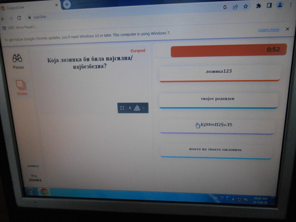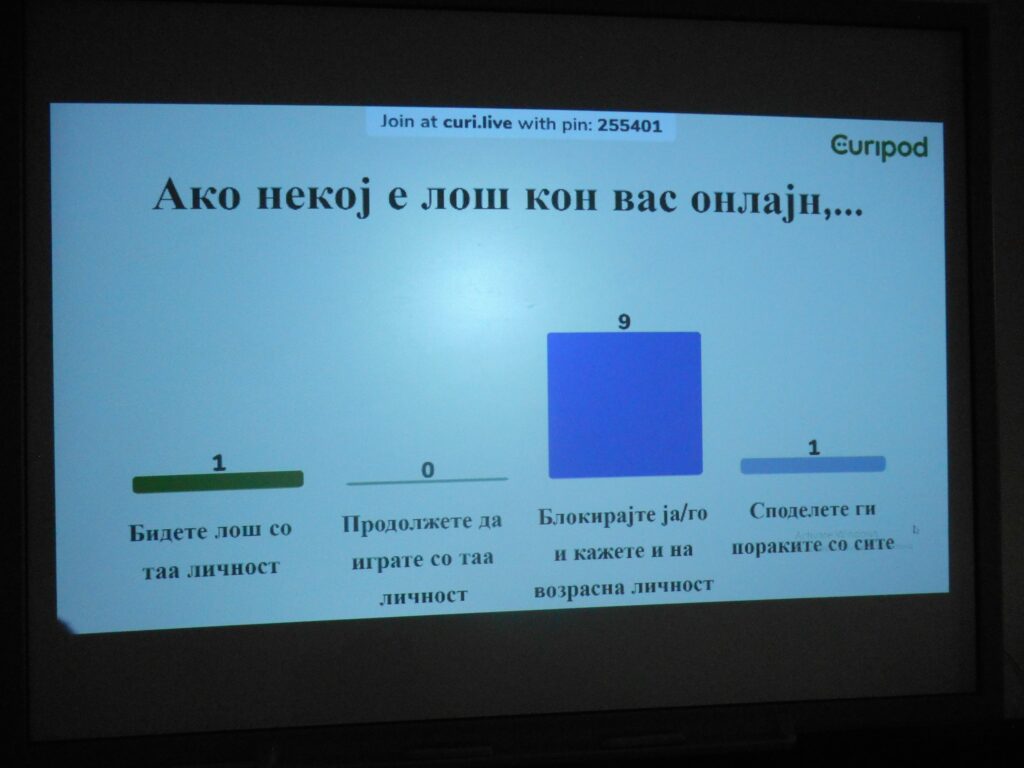 На крајот, преку кратки ситуациски прашања, учениците дискутираа што би направиле доколку станат мета на кибер (сајбер) напад, како да постапат ако некој ги вознемирува на интернет, како да реагираат при појава на сомнителни пораки и линкови, како и кои информации треба, а кои не треба да ги споделуваат онлајн.