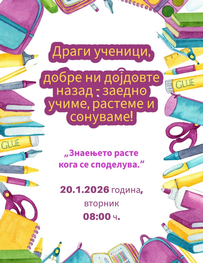 Со радост и позитивна енергија го започнуваме второто полугодие, кое започнува на 20.1.2026 година (вторник). По кратката пауза за одмор, повторно се враќаме во училиштето подготвени за работа, нови знаења и успеси.